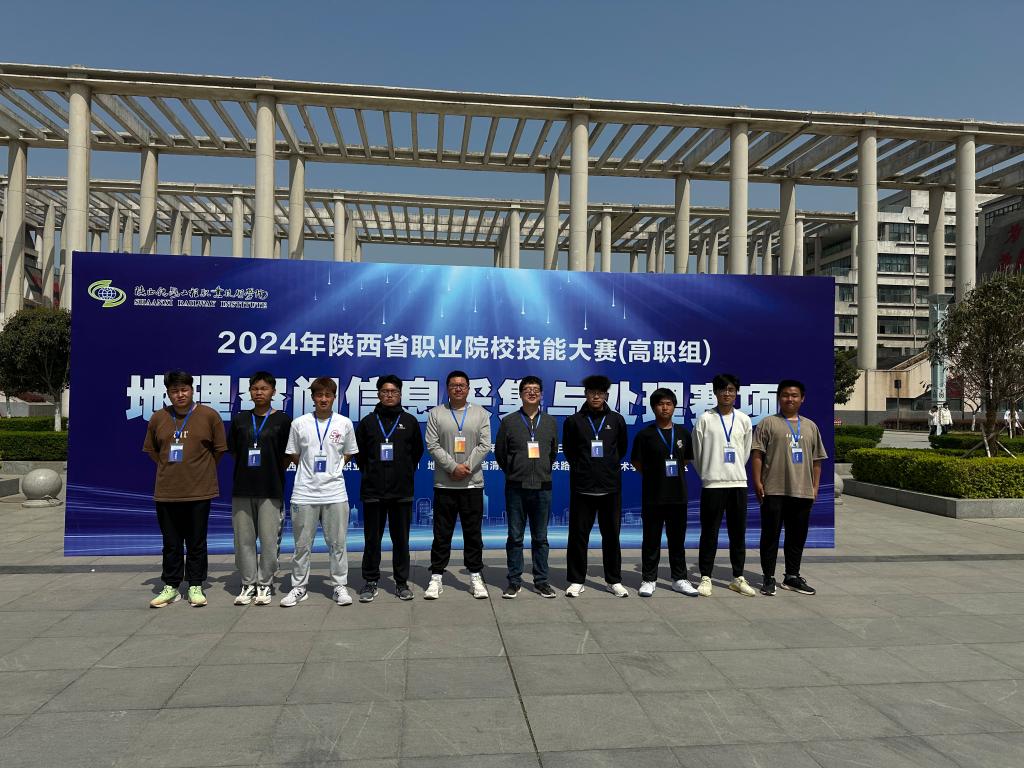 2024年3月29日至3月31日,陕西省职业院校技能大赛高职组“地理空间数据采集与处理”赛项在陕西铁路工程职业技术公司举行。经过两天的激烈角逐,tyc122cc太阳成铁道系以李鑫、贾强作为指导老师,由王浩俊、谭荣磊、郭凯强、蒲忠凯组成陕西机电职院一队获得第7名,由谭清明、李捷、刘正江、武上勋组成陕西机电职院二队获得第10名的优异成绩,较往年有所进步。