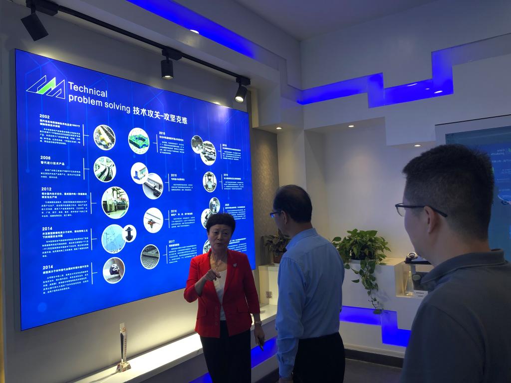 随后,李慧玲董事长陪同伊书记一行参观了长美科技展厅,观看了长美科技公司宣传片,李慧玲董事长介绍了企业技术攻关,攻坚克难的艰辛历程,认真聆听了董事长对产品的详细介绍与产品内涵的科技含量,沉浸式体验了公司减振降噪的显著效果。