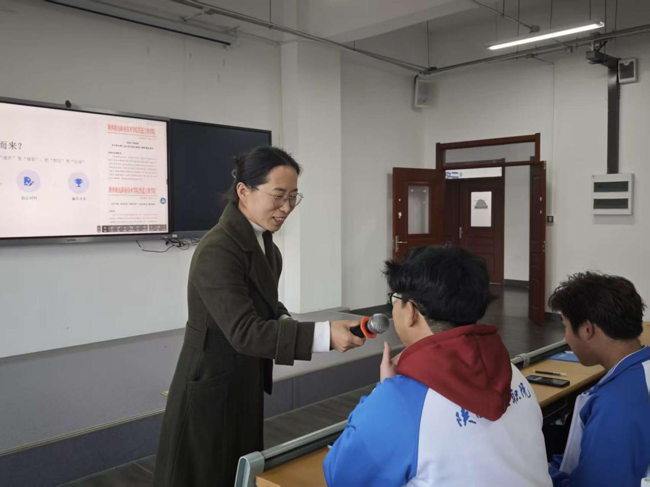 讲座中,张老师围绕职业规划大赛的核心要求展开深度辅导。她结合自身丰富的经验,从赛道选择、评分标准、材料准备、职业目标设定、路径规划逻辑、PPT制作技巧等关键环节进行了详细讲解,通过真实案例分析,指出了备赛过程中常见的误区与改进方向。针对“如何将个人兴趣与职业发展相结合”“如何突出自身优势与岗位适配度”“答辩环节的沟通技巧与心态调整”等学子关心的问题,进行了深入浅出的解答,并与现场同学展开互动交流,逐一回应提问,给出实用建议。