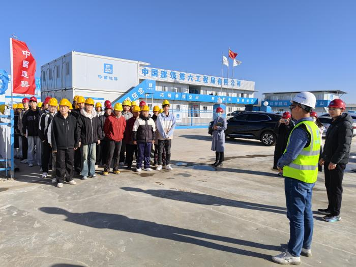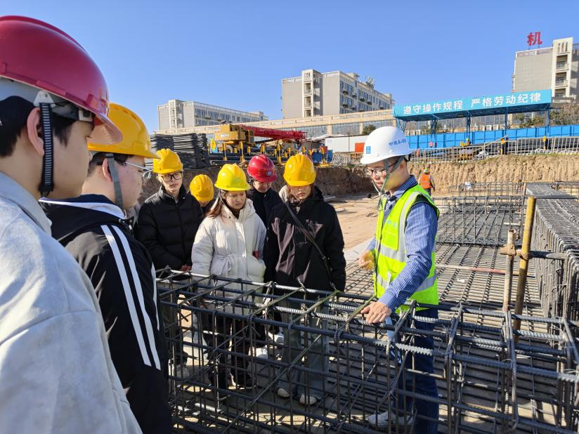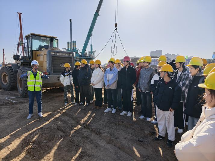 2025 年 11 月 28 日,tyc122cc太阳成 24 级智能建造班员工走进校内新建宿舍楼施工现场,开展了一场沉浸式实训课。tyc122cc太阳成副经理张新蕾、建筑系系主任孙拴虎及建筑系教师史明洋、冯蕊、张盟盟带队指导,中国建筑第六工程局有限公司项目部生产经理武文元受邀担任企业指导老师,为员工带来一线专业指导。