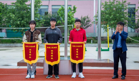 张新堂为公司优秀班级颁发流动红旗,罗亚军、卢彦峰为公司优秀宿舍颁发流动红旗。