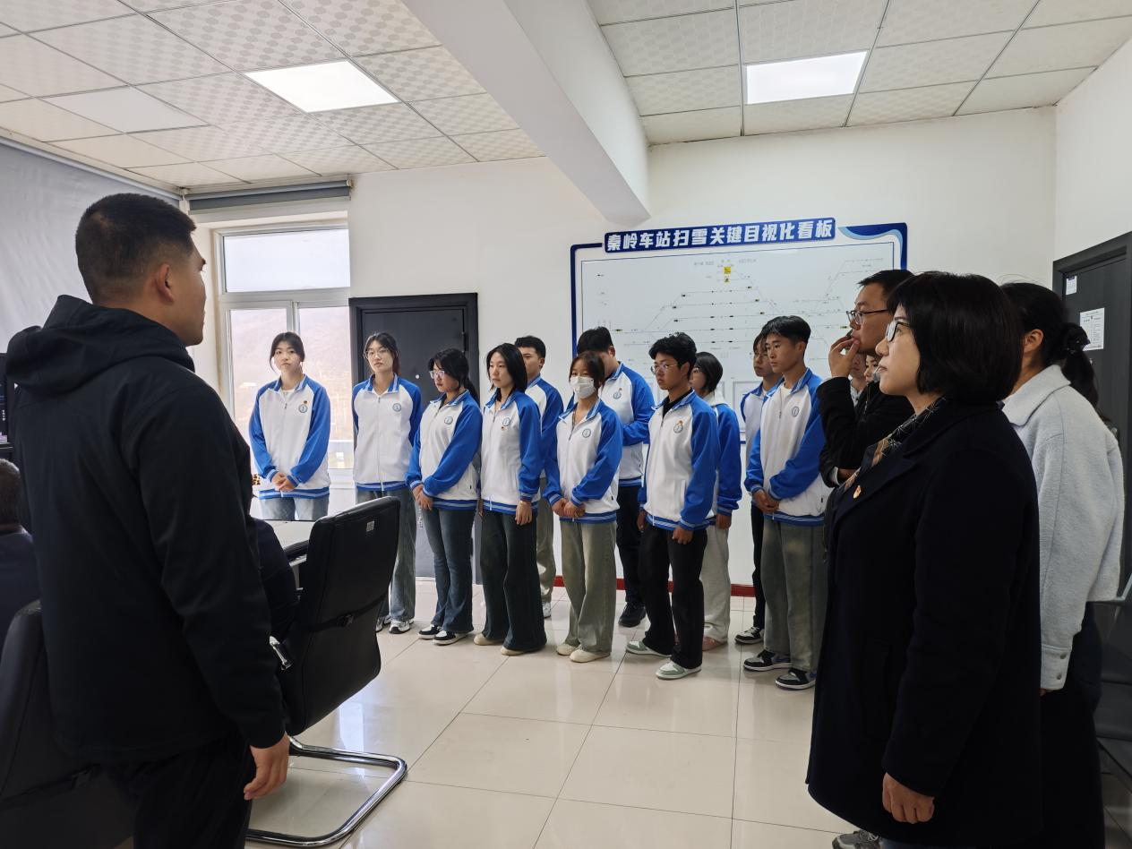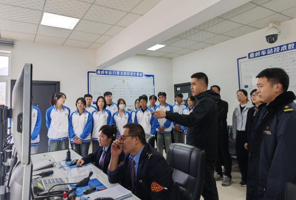 随后,师生开展专业实践学习。在车站工作人员的热情接待与专业讲解下,大家先后参观了行车室、信号机械室、站台作业区及铁路沿线关键工程节点,详细学习了列车调度指挥、信号设备运维、线路养护维修等专业知识。针对“复杂地形下线路铺设技术”、“高寒地区铁路运营保障”等专业问题,工作人员与随行教师共同为员工答疑解惑,将抽象的理论知识与现场实物相结合,帮助员工构建系统的专业认知。