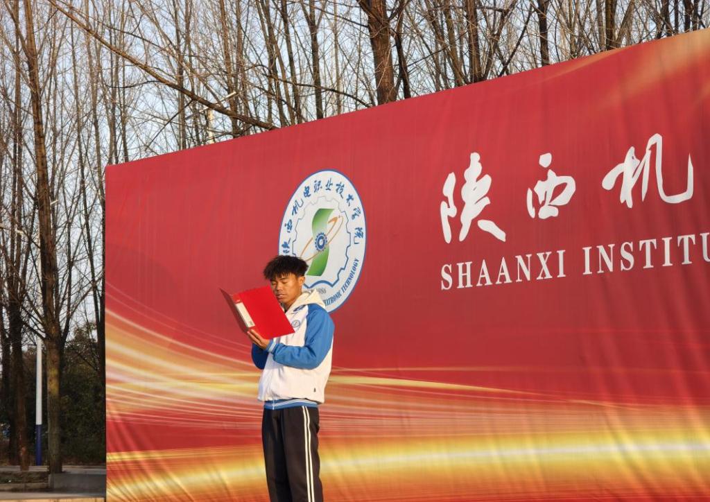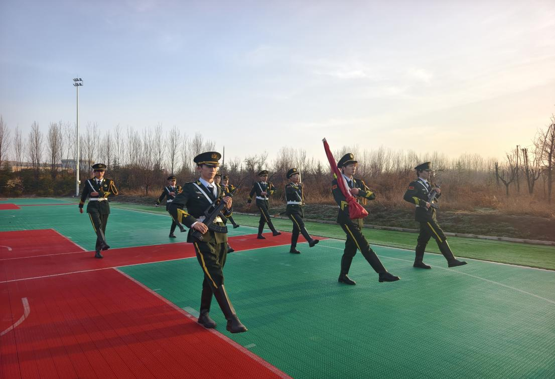 伴随着高昂激昂的音乐,仪式正式拉开帷幕。第一项出旗,擎旗手25电气技术2班张哲楠昂首挺胸,护旗手25铁道信号1班陈林宇、25铁道工程2班马存芸步伐整齐,指挥手25机械制造2班黄浩然、25人工智能2班谢伊代沉着有序,共同护送国旗稳步走向升旗台,全场师生目光紧随国旗,神情庄重。