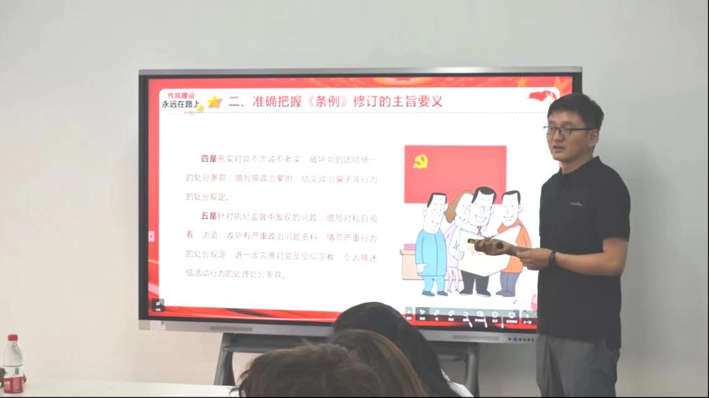 李帅同志以“新修订《中国共产党纪律处分条例》学习”为主题进行授课,从《条例》修订的重要意义、主旨要义、要点及学习要求等方面对《条例》进行了详细解读。他强调作为一名入党积极分子,要以一名党员的标准严格要求自己,学习先锋模范作用,在学习和生活中要严格遵守党的纪律,勤奋学习,开拓创新。
