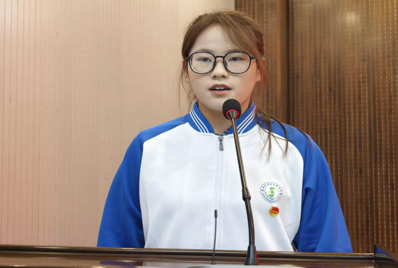 “我志愿加入中国共产主义青年团,坚决拥护中国共产党的领导……”在魏煜昊同学的领誓下,全体新团员面向鲜艳的团旗,举起右拳,庄严宣誓。铿锵有力的誓言回荡在会场,既是新团员们对共青团组织的郑重承诺,也展现了他们为共产主义事业奋斗的坚定决心。宣誓完毕,新团员代表李紫潼同学上台发言。她分享了加入共青团的激动心情与真切感悟,表达了对团组织培养的感恩之情。
