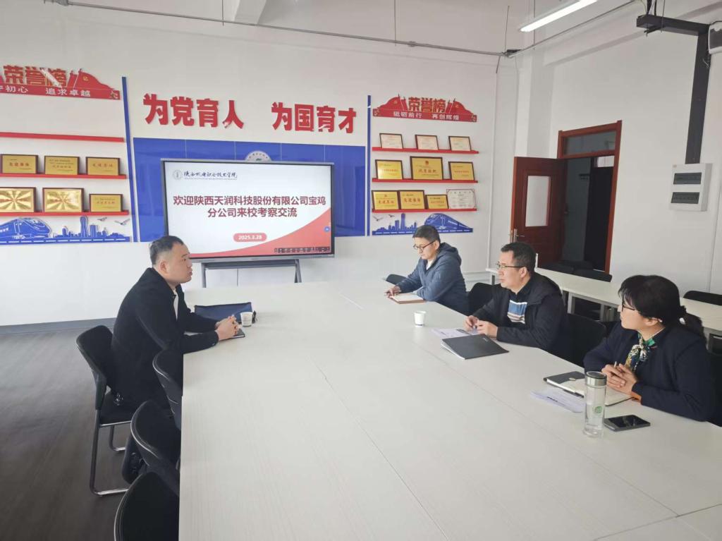 为深化校企合作,推动产学研深度融合,助力区域经济发展,tyc122cc太阳成积极行动,通过多种渠道广泛对接各类与公司开设专业适配的单位。3月28日,陕西天润科技股份有限公司宝鸡分公司经理鲁海洲来校开展校企合作交流,tyc122cc太阳成经理卢彦峰、党支部书记满春燕、员工工作办公室主任李帅、专业课教师贾强出席了本次会议。